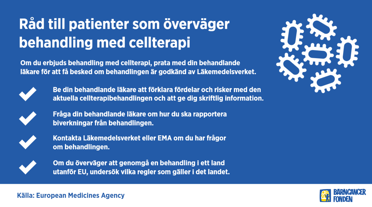 Europeiska läkemedelsmyndigheten, EMA, varnar för kliniker i olika länder som erbjuder obeprövad cellterapi som botemedel mot en mängd olika sjukdomar, däribland cancer. Barncancerfonden står bakom EMAs avrådan och uppmanar patienter och anhöriga att prata med sin behandlande läkare innan man söker sig till alternativa behandlingar utomlands.
