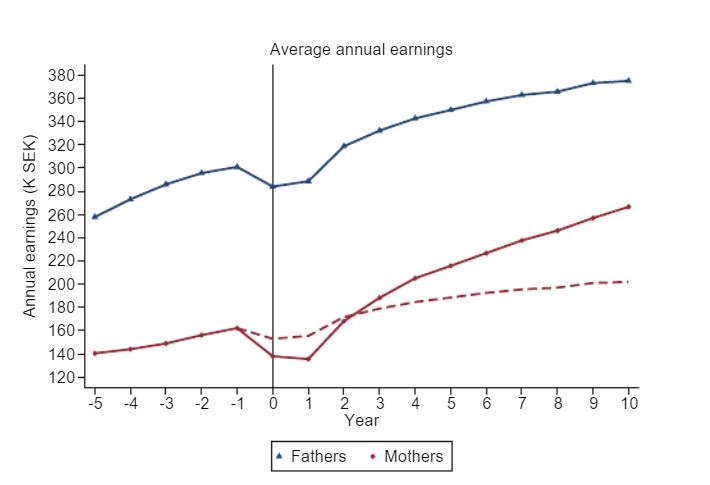 Men efter några år utvecklades mammornas, till skillnad från pappornas, inkomster positivt. En anledning till det kan vara att mammorna i högre grad jobbat deltid när barnen varit små och sedan gått upp i tid.