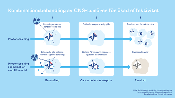 I dag används oftast den senaste tekniken för strålbehandling vid hjärntumörer, så kallad protonterapi, som är extra skonsam mot den friska vävnaden. Tyvärr är det ändå många tumörer som lyckas överleva behandlingen. Så, vad skulle hända om det gick att kombinera strålbehandling med någon form av läkemedel som hade förmågan att riktat slå ut just cancercellernas förmåga att reparera sig själva, men lämna den friska vävnaden ifred?