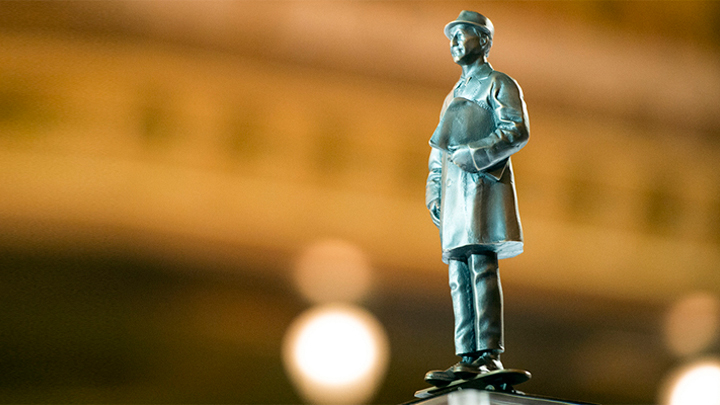 Prisstatyetten är en avbildning av en ikonisk bild ur svensk humorhistoria – Papphammar på skateboard ur Gösta Ekmans film, Från och med herr Gunnar Papphammar, från 1981.