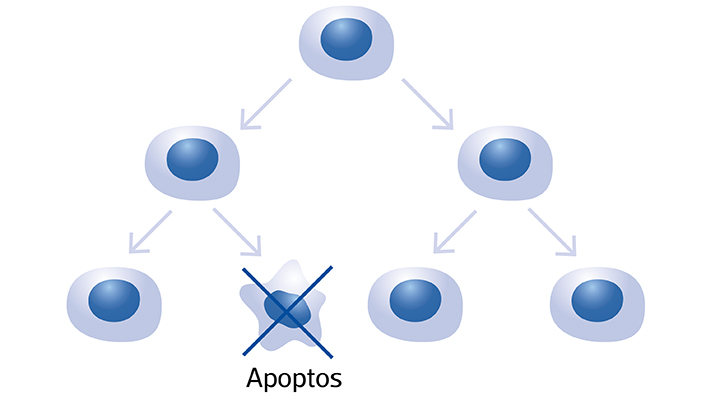 Generna som styr celldöden är avstängda i en cancercell. Samtidigt saknar de en annan viktig säkerhetsfunktion. Medan friska celler delar sig ett begränsat antal gånger innan de drabbas av apoptos, delar sig de sjuka cellerna obegränsat. Ju mer de delar sig, desto fler förändringar och fel samlar de på sig. Vissa av förändringarna gynnar tumören, till exempel sådana som gör att kroppens immunförsvar inte kan känna igen och radera dem.