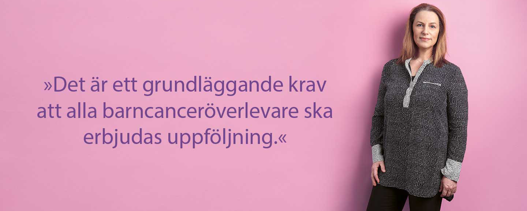 Sedan 2016 finns ett nationellt vårdprogram för uppföljning av barncancer, och Barncancerfonden anser att det är av yttersta vikt att det programmet implementeras och följs i hela Sverige. Det är ett grundläggande krav att alla barncanceröverlevare ska erbjudas uppföljning, och att de som riskerar att drabbas av komplikationer ska fångas upp och få rätt vård i tid. I dag bygger dessutom delar av uppföljningsarbetet på några få eldsjälars dedikerade engagemang. Det är inte ett hållbart system för framtiden.