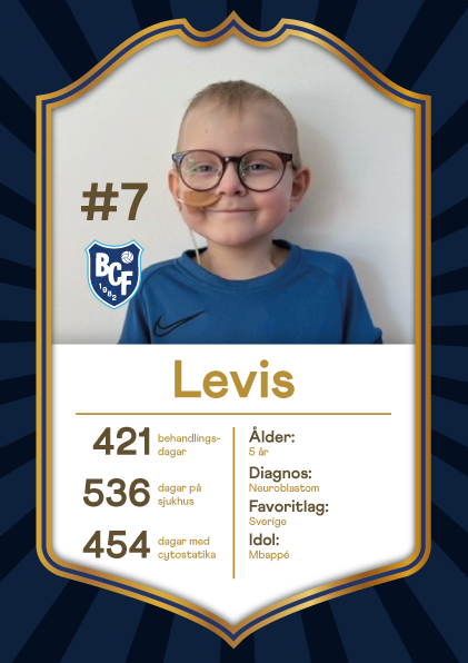 Levis, vår centrala mittfältare, blev bara 5 år. Han dog den 2 juni 2024, inte långt efter att han träffat både sitt BCF-lag och förbundskaptenen Janne Andersson. Levis hann också träffa Lucas Bergvall och tillsammans med honom spela fotboll en hel eftermiddag. Hans favoritspelare var dock Kylian Mbappé. Levis var som en pingpongboll - ett riktigt energiknippe!
