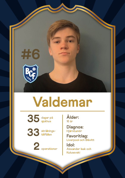Valdemar, 16 år, har genomgått 33 strålbehandlingar för en hjärntumör. För honom betyder fotbollen allt, där träning, rörelse och sporten varit en helande del. Idolerna är Alexander Isak och Dejan Kulusevski. Favoritlagen är Blåvitt och Liverpool .