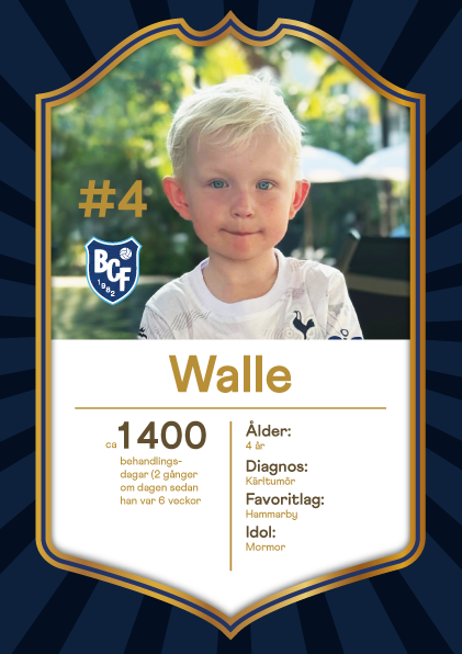 Walle, 4 år, har behandlats 2 gånger om dagen för kärltumör sedan han var 6 veckor gammal. Därför betyder det extra mycket för honom och familjen att han nu kan springa och spela fotboll i trädgården utan att ha ont. Favoritlaget är Hammarby medan idolen är mormor.