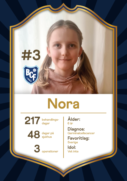 Nora, 6 år, germinalcellscancer. För Nora, vars favoritlag är Sverige, har fotboll och rörelse inneburit att få känna gemenskap och vara som alla andra. Och att få vara frisk.