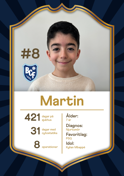 Martin, 8 år, wilms tumör. Fotboll var den första sporten Martin började med efter sin behandling och han tycker det är roligt att spela både med vänner i laget och i skolan. Martin håller på PSG, där favoriten är Kylian Mbappé.