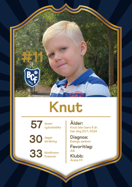 Knut, 8 år, Ewings sarkom. Knut var taggad inför Fotbollströjefredag och såg fram emot att vara en del av Barncancerfondens lag, men sorgligt nog avled han den 20 januari. Knut var en glad, underfundig och stark person, som fick alla att bli glada och må bra. Han var en backtalang som spelade i Årsta FF, en riktig lagspelare som älskade att vinna rättvist. Favoritlagen var AIK och Manchester United, där Victor Nilsson Lindelöf var favoriten.