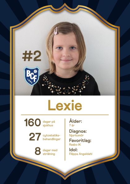 Lexie, 7 år, har behandlats för wilms tumör, en form av njurcancer. För Lexie betyder fotbollen att hon får ha roligt med sina kompisar. Hemmalaget Rasbo IK är favoriterna, men hon hejar även på AIK och Sirius. Favoritspelare är Filippa Angeldahl.