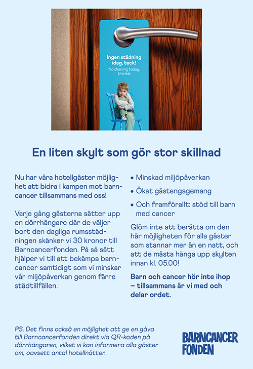 Barn och cancer hör inte ihop. Därför hoppas vi att du vill vara med oss i kampen mot barncancer. För när du som gäst hos oss väljer att hoppa över den dagliga rumsstädningen skänker vi 30 kronor till Barncancerfonden 💙 Varmt välkommen
