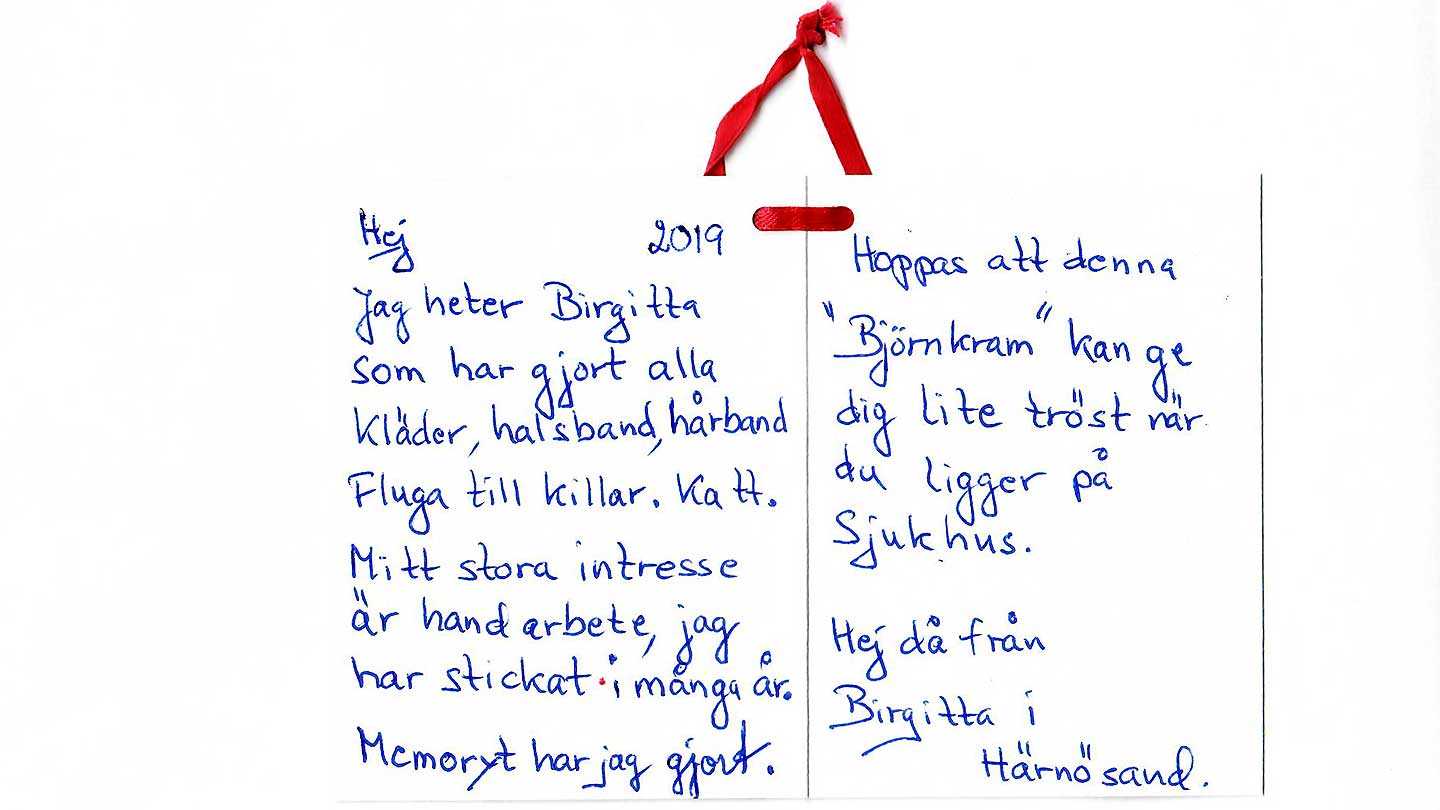 – Hoppas att denna ”Björnkram” kan ge lite tröst när du ligger på sjukhus, hälsar Brigitta Alexandersson i sitt handskrivna kort.
