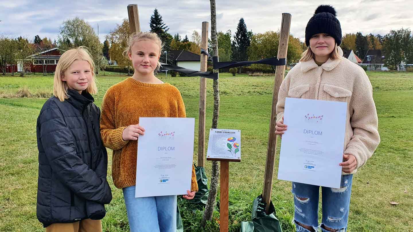 Malva Thermell, Ella Sandahl och Stella Svanberg vid minnesträdet, och med Barncancerfondens diplom för insamlingen som gav 31 065 kr.