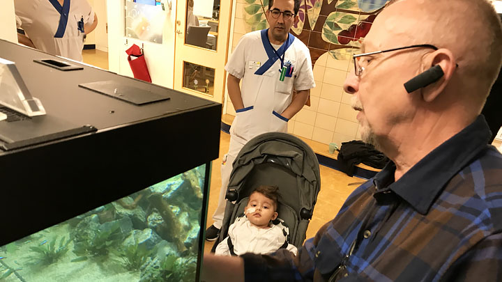 – Barnen som behandlas behöver också få leka, förklarar Magnus. Och tyvärr är det ju så att många mår bra när de kommer hit, men blir ”sjuka” av behandlingen, och då är det bra att det finns saker att glädja med – som t.ex. akvariet, som blir en del av barnens lek i en svår situation.