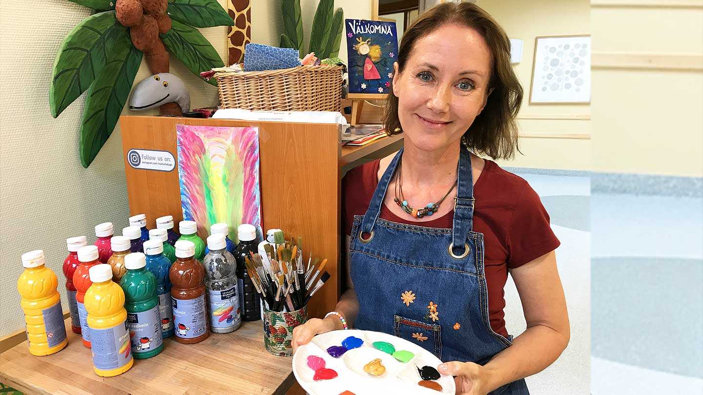 Två dagar i veckan rullar bildterapeuten Jeanette Omra in sin vagn på avdelning 95A/B på Akademiska barnsjukhuset i Uppsala, och det har hon gjort sedan 2003. I år fyller Målarverkstan 20 år och på avdelningen hoppas man nu på att kunna sätta upp en jubileumsutställning som offentligt visar upp verksamheten och det som har skapats under åren. Här återfinns såklart mycket måleri, men de inneliggande familjerna på barnonkologen erbjuds även keramik, pyssel, pärlor, ulltovning och mycket mer. Det senaste är att i kombination med bildskapandet få prova på att spela på kristallskålar och andra lite udda musikinstrument, något som skapar en lugn och nästan lite mystisk stämning i de annars ganska sterila sjukhuskorridorerna.