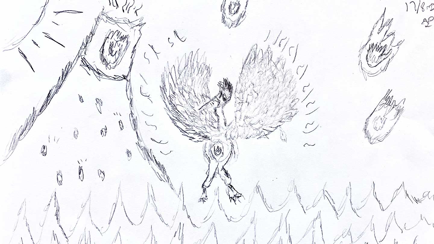 – Den här teckningen är skapad av en 12-årig pojke som fått återfall av sin cancer, berättar Jeanette. En svår behandling väntade och han var såklart mycket orolig. Pojken målade då en Fågel Fenix* som reser sig över elden. Jag ser den här bilden som ett sätt att samla krafter och övervinna rädslorna. Att anta utmaningen, trots att elden är nära. Att måla och teckna är ett sätt att spegla sig själv och sina styrkor.