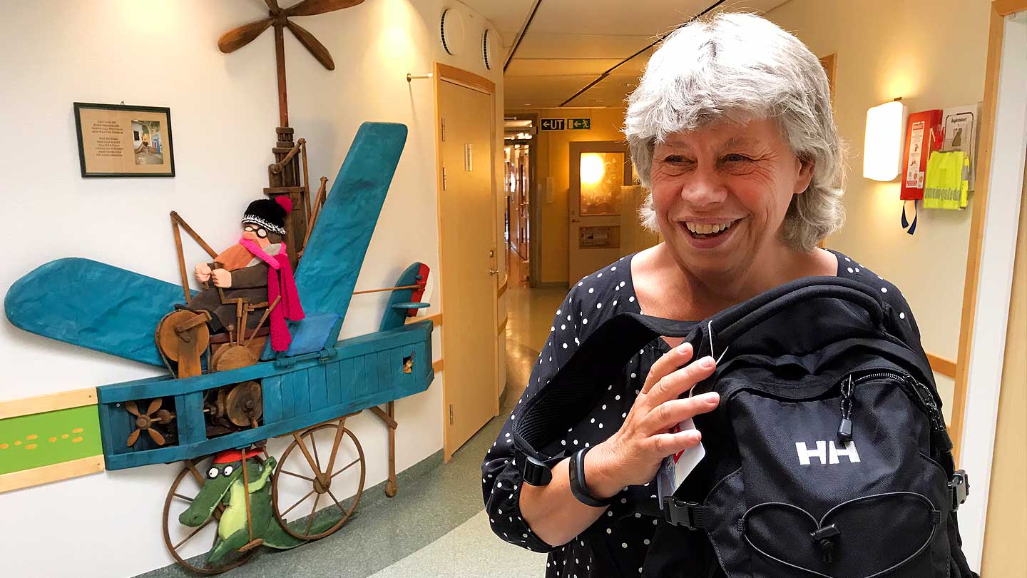 Eva Turup har varit den person som ofta fått uppdraget att dela ut Barncancerfonden Mellansveriges ryggsäckar till patienterna på avdelningen. Barncancerfonden Mellansverige vill tacka Eva för hennes långa och fina arbete i samarbete med föreningen, och det var därmed på sin plats att hon själv avgick med en fullpackad ryggsäck som avskedspresent.