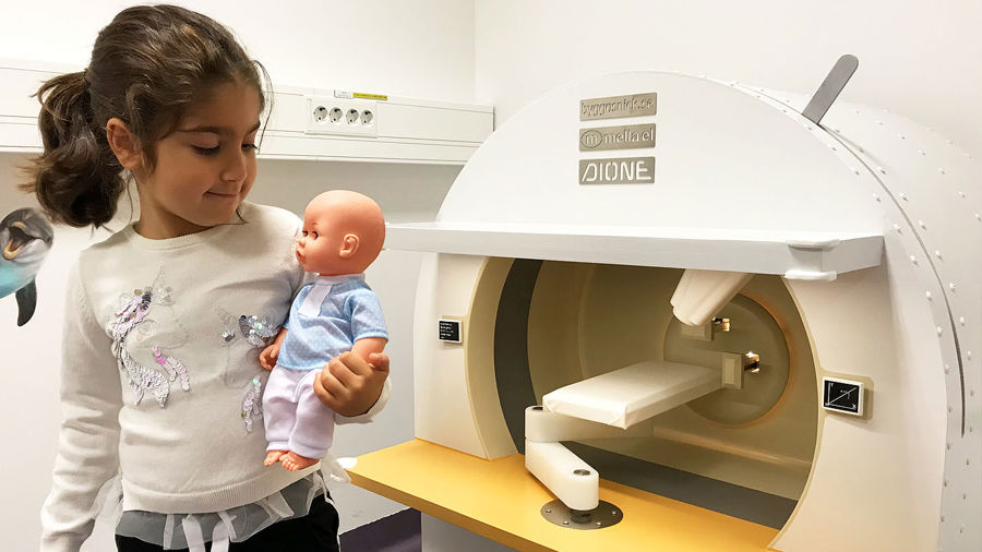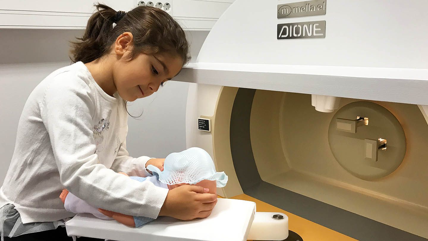 – Dockan har också en viktig funktion, förklarar Ulrika. Barnen kan ta på och av masken, som ska sitta lite tajt, och då kan vi säga att ”så här kommer det att bli för dig också.” Vi kan vrida och vinkla behandlingsbordet, dra ut bildplattorna och ställa in strålfältet och apparathuvudet, precis som på riktigt, och därmed demonstrera hela behandlingsförloppet, som i sig inte heller tar så lång tid alls.