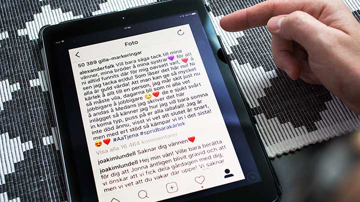 Alexander Falk dog av osteosarkom, men han lever på nätet. Ett år efter hans död har hans sista inlägg på Instagram drygt 50 000 gilla-markeringar – och antalet växer fortfarande. – Det gör att allt känns mindre meningslöst, säger Thomas Falk, Alexanders pappa.