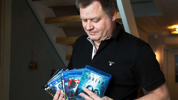 Thomas hämtar en hög med dataspel och filmer som han köpt för att Alexander önskade sig dem, men omslagsplasten är kvar.