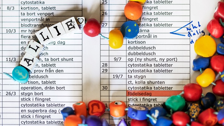 Jenny plockar fram dagboken för att minnas, och Allies ”supersnöre”. På snöret får cancerdrabbade barn trä en pärla för varje händelse på sjukhuset: röntgen, blodprov, prova ut mask för strålning, ta medicin, sova över...