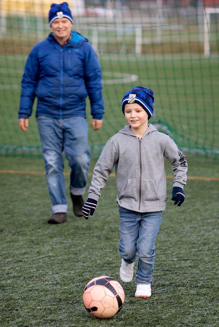 Sedan är han borta i ett huj. På fotbollsplanen har han bara ögon för bollen och han har tagit av sig jackan i kylan. Hunden Pepsi gläfser i Pernillas koppel och tittar längtansfullt på pojkarnas lek.