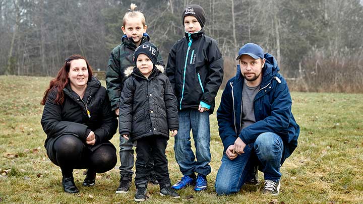Där sitter storebrorsorna Scott, åtta år, och Colin, tio år, mamma Johanna och pappa Hannu. Eddie håller i en innebandyklubba, som är lika lång som han själv.