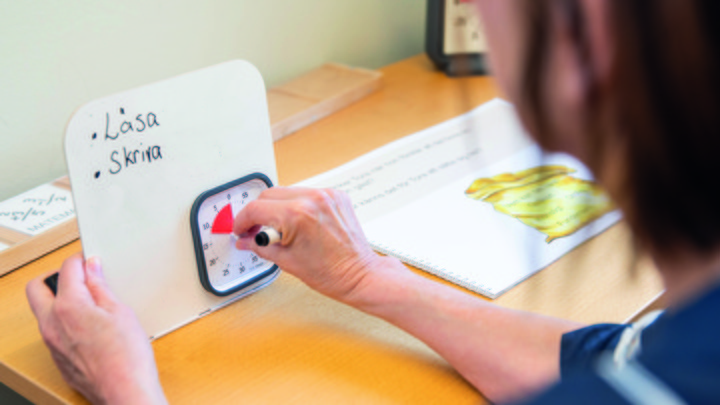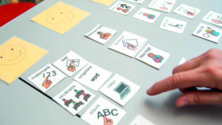 I en korridor finns elevernas personliga scheman illustrerade med bilder, och i ett litet klassrum ligger visuella hjälpmedel på bänkarna för att barnen lättare ska kunna berätta om sina svårigheter. Genom olika uppgifter testas funktioner som exempelvis kan påverka lästakt, berättande och problemlösning.