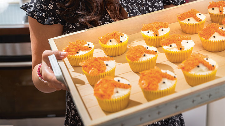 Belén spritsar ut orangefärgad smörkräm så att muffinsarna ser ut som rävar.