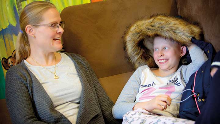 För Maria Strand och Tindra har onsdagarna på hemsjukhuset blivit en trygg punkt sedan dottern blev sjuk. Veckodagen är öronmärkt för ”det som måste göras” vilket bland annat betyder att alla som är inblandade i Tindras behandling är samlade på ett ställe. Såväl läkaren som kuratorn är på plats och ingen har bråttom. Det finns utrymme att vädra alla funderingar som familjen har samlat på sig under veckan.