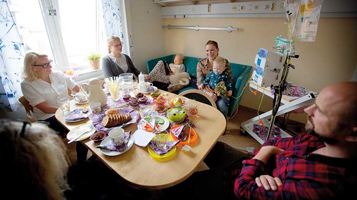 Den personliga miljön på hemsjukhuset är en trygghet i allt det svåra. Mellan provtagningar och behandlingsinsatser på sjukhuset i Halmstad träffas barncancerdrabbade familjer över en fika.