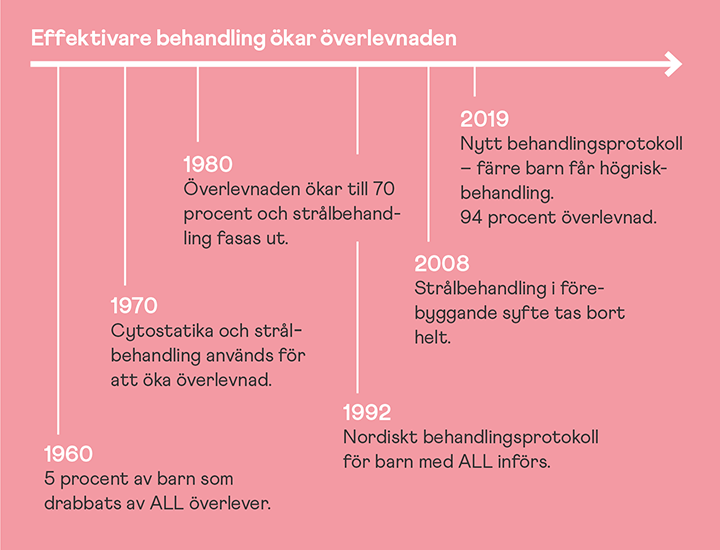 Idag överlever cirka 95 procent av alla barn som drabbas av akut lymfatisk leukemi och mycket forskning, finansierad av Barncancerfonden, handlar om att hitta behandlingsmetoder som är tillräckligt effektiva för att bota cancern men samtidigt så skonsamma som möjligt för att minska risken för sena komplikationer.