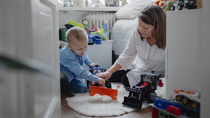 ”Vi sitter mycket och leker på golvet med tågbanor, Lego och sånt. Traktorer är hans stora intresse, och skördetröskor och stora maskiner: Men farmor, det där är inte en lastbil, det är en dumper. Haha, han har lärt mig mycket om fordon och olika märken. Och han är bara fyra. Han är speciell den där lille gullungen, helt otrolig.”