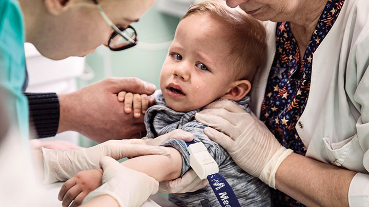Det tog lång tid att sticka honom. Han kom in i behandlingsrummet på sin pappas arm. Läkarna misstänker att han lider av en blodsjukdom och precis som i Sverige vårdas även barn med ovanliga blodsjukdomar på barncanceravdelningen.