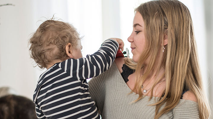 Någon gör sig påmind. På golvet tar sig lillebror Viggo, 1,5 år, fram på något ostadiga ben. Han sträcker upp sina knubbiga armar mot Hedda och kräver en kaka. Han ler.