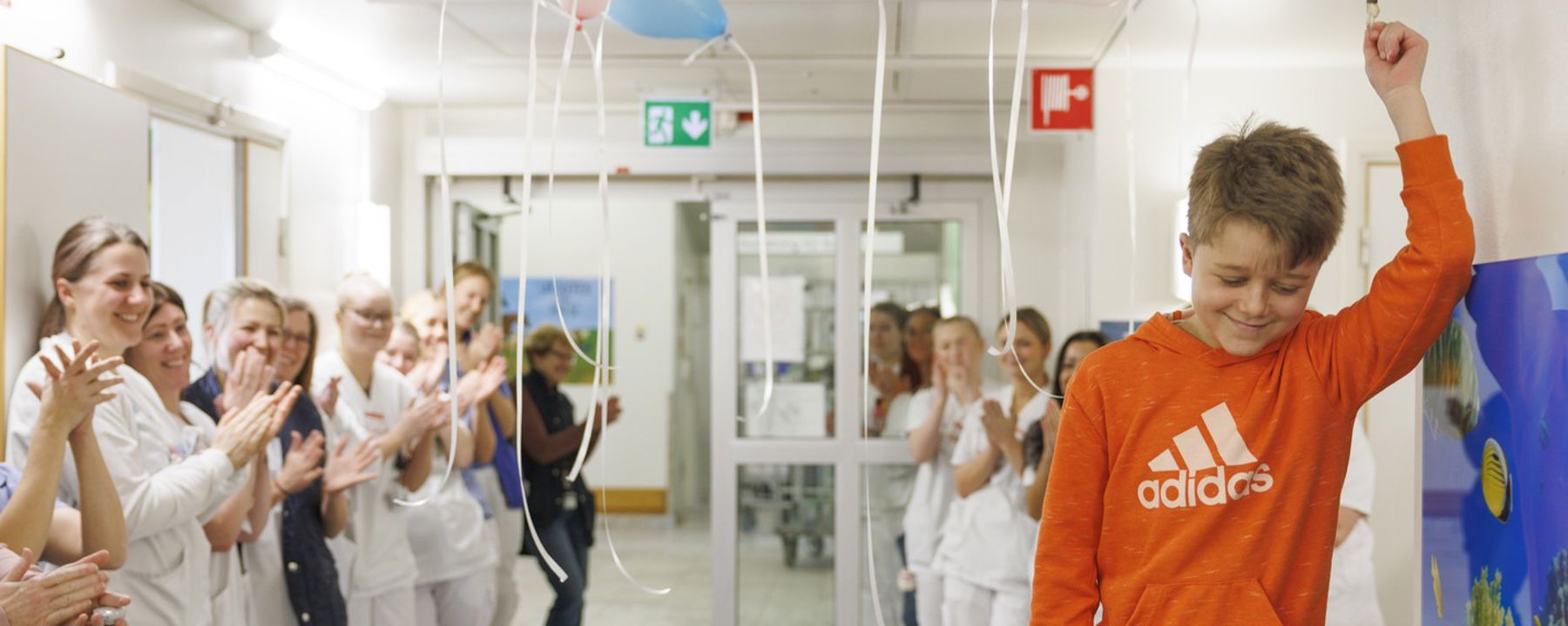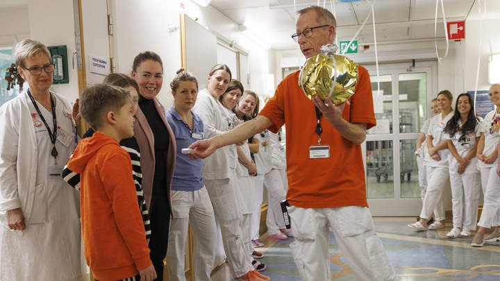 Nu är det äntligen dags för Nadim att ringa i klockan på Halmstad sjukhus. Personalen har ställt fram en pall så att han ska nå upp för att dra i snöret. När pinglet från klockan har tystnat bryter jublet ut. Alla applåderar och hurrar för Nadim.