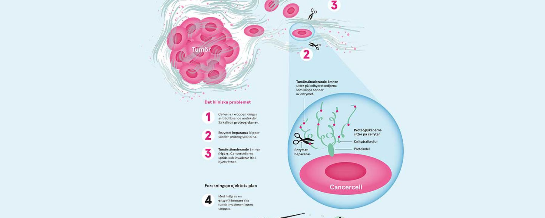 Teamet har upptäckt att det är en biokemisk katalysator, enzymet heparanas, som leder till att kolhydratkedjan bryts ned och tumören växer. Prover från hjärntumörer hos barn innehåller större mängder av enzymet än en frisk hjärna.