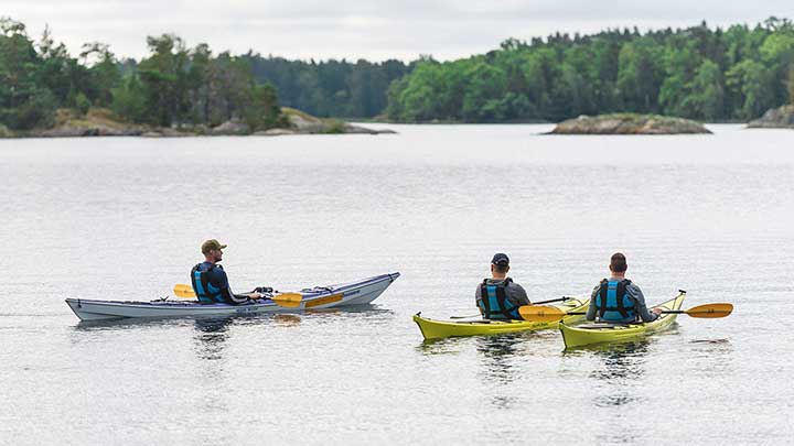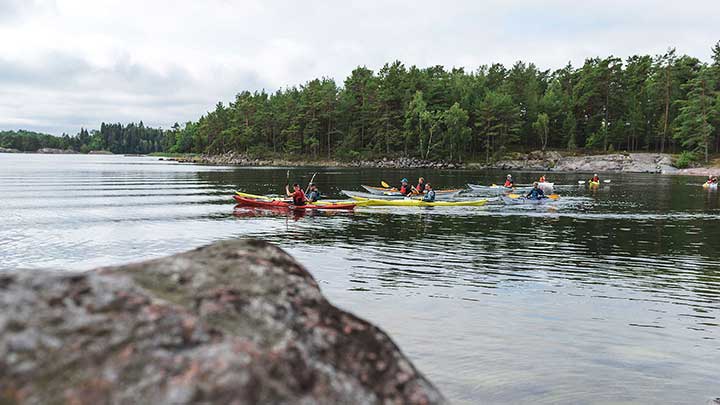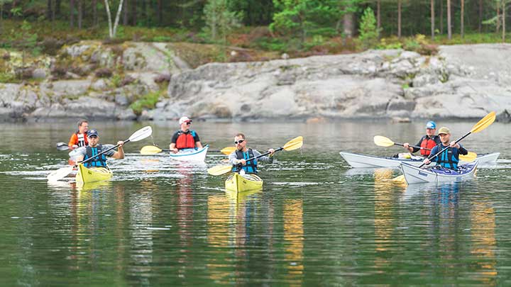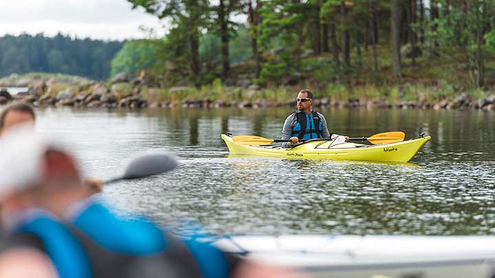Tystnaden är nästan total, förutom vattendropparna som faller från paddlarna och smattrar mot den spegelblanka ytan. Tio kajaker glider över Tjust skärgård en lördag i augusti, och det är som om naturen har beslutat att ta en paus. Jonas Nilsson fäller ner blicken. Vattnet är ovanligt klart och han ser flera meter ner i djupet. Han styr i riktning från de övriga i gruppen, andas in luften och passar på att njuta av stunden.