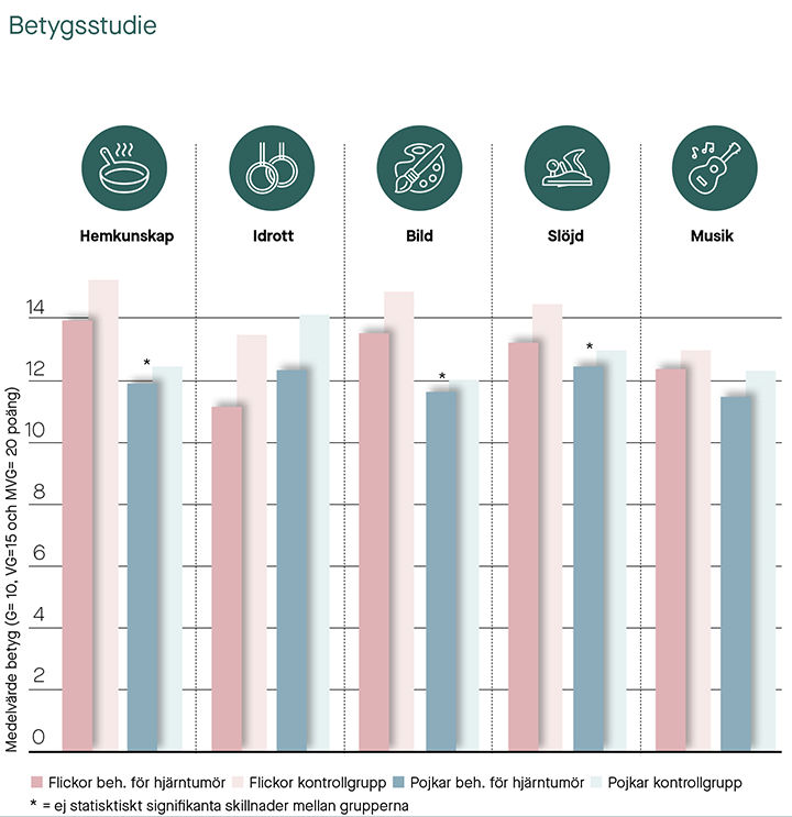 Sedan tidigare har gruppen redovisat resultat som visar att barn som behandlats för hjärntumör i högre utsträckning får lägre betyg i kärnämnena svenska, engelska och matematik. Även antalet barn som blir behöriga till gymnasiestudier är signifikant lägre i gruppen barn som behandlats för hjärntumör.
