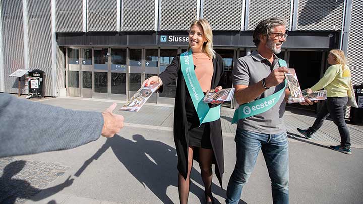 Hon håller i trådarna och är med och delar ut broschyrer vid Slussen hela dagen tillsammans med Susanne Ericsson, CRM-coordinator på Ecster. De andra medarbetarna byter av varandra. Alla anställda som vill är med vid den tidpunkt och så länge de kan utifrån sina scheman.