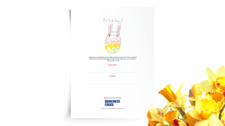 Påskägg fullt av hopp I stället för att skicka ett påskägg fylld med onyttigheter ... ett fint gåvobevis och stöd kampen mot barncancer. Då sprider du samtidigt hopp till alla