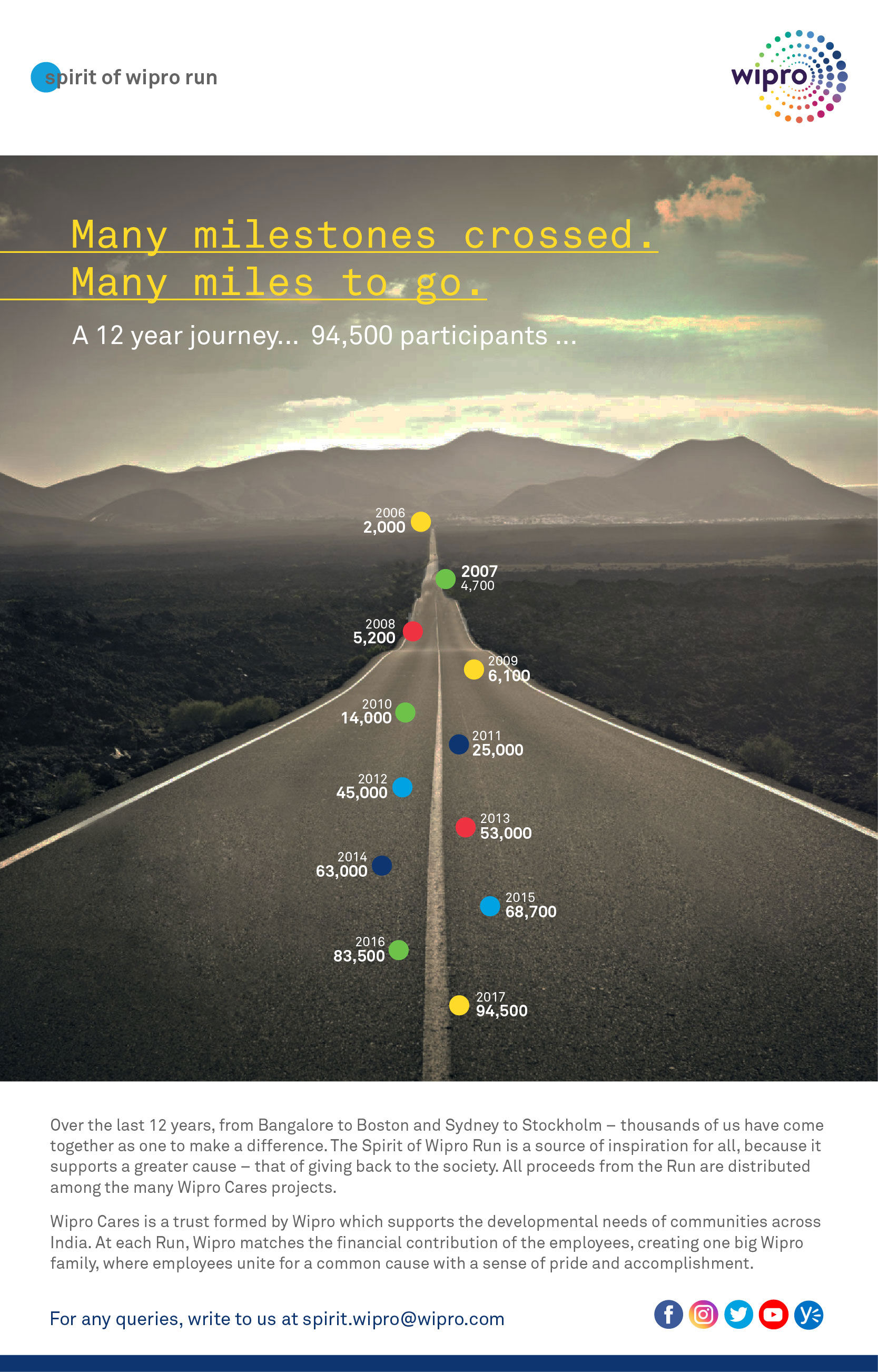 Over the last 12 years, from Bangalore to Boston and Sydney to Stockholm - thousands of us have come together as one to make a difference. The Spirit of Wipro Run is a source of inspiration for all, becuase it supports a greater cause - that of giving back to the society.